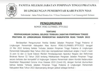 Read moreNias, suarainvestigasi.com - Berdasarkan pengumuman Panitia Seleksi Jabatan Pimpinan Tinggi Pratama di lingkungan Pemerintah Kabupaten Nias Nomor PENG-01/PANSEL-JPTP/2022 tanggal 23 ...