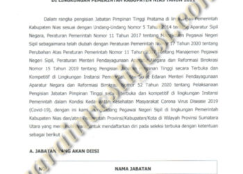 Nias, suarainvestigasi.com - Dalam Rangka Pengisian Kekosongan Jabatan Pimpinan Tinggi Pratama di Lingkungan Pemerintah Kabupaten (Pemkab) Nias, kembali membuka Seleksi ...