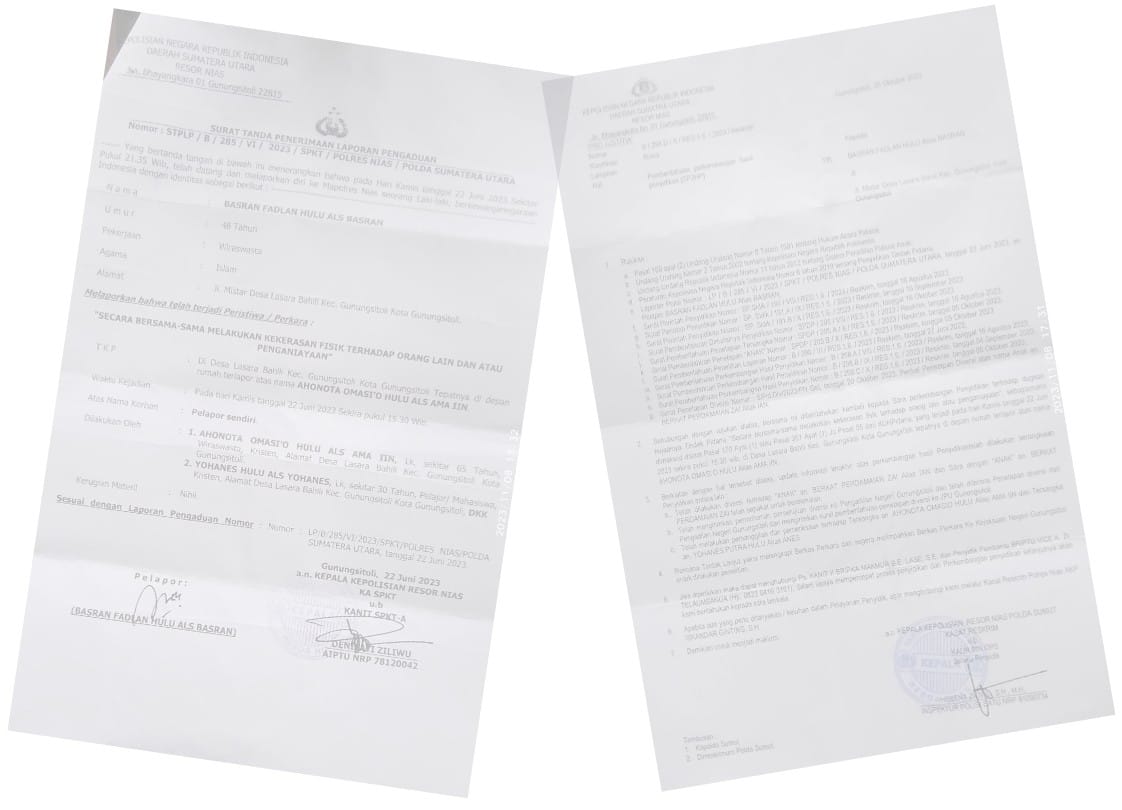 Sebagaimana sebelumnya surat Laporan korban Nomor : STPLP/B/285/VI/2023/SPKT/POLRES NIAS/POLDA SUMATERA UTARA, bahwa pada hari kamis tanggal 22 Juni 2023 sekira pukul 21:35 Wib, telah melapor di Mapolres Nias atas nama Basran Fadlan Hulu alias Basran Alamat Jl. Mistar Desa Lasara Bahili, Kecamatan Gunungsitoli, Kota Gunungsitoli melaporkan telah terjadi peristiwa/perkara secara besama-sama melakukan kekerasan fisik terhadap orang lain dan atau penganiayaan.