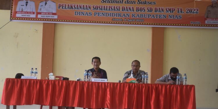 Nias, Suarainvestigasi.com – Dinas Pendidikan Kabupaten Nias mengadakan Sosialisasi Dana Bos Reguler SD dan SMP Tahun Anggaran 2022 yang bertempat di Aula Paroki Kristus Raja Gido Desa Hiliweto, Kecamatan Gido, Kabupaten Nias, Jumat (08/04/2022)
