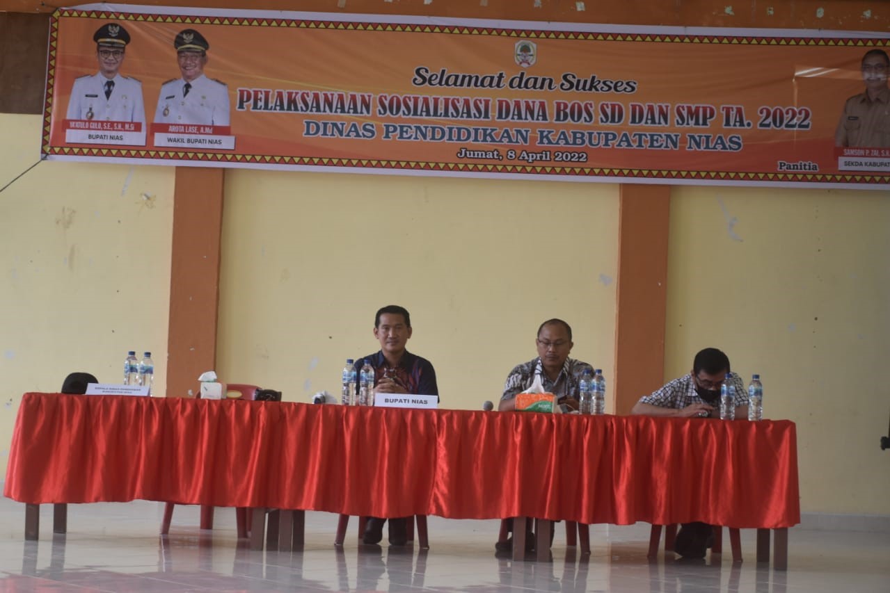 Atas nama Pemerintah Kabupaten Nias, Bupati Nias berharap agar dapat bekerja sungguh-sungguh dan bertanggungjawab sesuai Tugas dan fungsinya sesuai Aturan yang berlaku. Kepala Sekolah dan Bendahara dapat menjalankan seluruh prosedur dan tata kelola Dana BOS dengan mempedomani Peraturan Menteri Pendidikan, Kebudayaan, Riset, dan Teknologi Republik Indonesia Nomor 2 Tahun 2022, Peraturan Menteri Dalam Negeri Republik Indonesia Nomor 24 Tahun 2020 Tentang Pengelolaan Dana Bantuan Operasional Sekolah pada Pemerintah Daerah dan Permendagri Nomor 77 Tahun 2020 Tentang Pedoman Teknis Pengelolaan Keuangan Daerah.