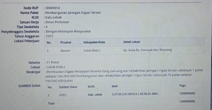 “Berdasarkan data rencana umum pengadaan, ada sekitar 11 paket kegiatan jaringan irigasi tersier, yang dilaksanakan oleh Dinas Pertanian Kabupaten Lebak, kami mengapresiasi kegiatan tersebut, sebab kebutuhan infrastruktur pertanian, menjadi modal utama peningkatan swasembada pangan” kata Mamik Slamet, dihubungi via WhatsApp, Jum’at, 08/08/2025.