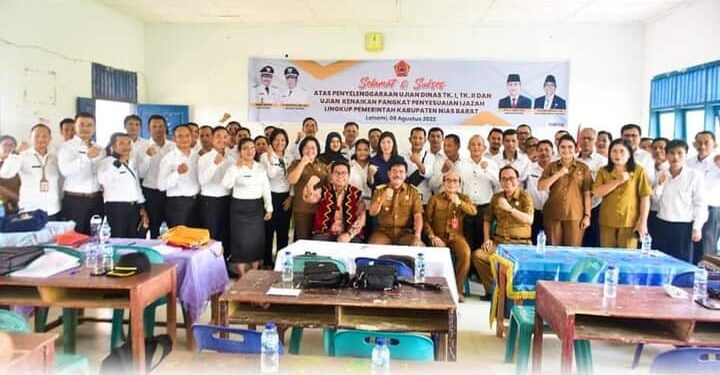 Nias Barat, suarainvestigasi.com –Bupati Nias Barat, Khenoki Waruwu didampingi Sekda Prof. Dr. Fakhili Gulo dan Kepala BKPSDM, Dalizaro Waruwu, S.Pd membuka pelaksanaan Ujian Dinas TK, I, II dan Ujian Kenaikan Pangkat Penyesuaian Ijazah Lingkup Pemkab Nias Barat di Gedung UPT. SMP Negeri 2 Lahomi, Onolimbu, Kecamatan Lahomi, Selasa (09/08/2022).