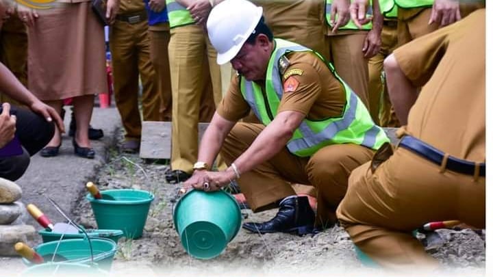Nias Barat, suarainvestigasi.com – Bupati Nias Barat Khenoki Waruwu, melakukan Peletakan Batu Pertama Pembangunan Trotoar, Drainase dan Lampu Jalan di sepanjang Ruas Jalan Ibu Kota Kabupaten Nias Barat, dimulai di Depan Kantor Bupati Nias Barat, Desa Onolimbu, Lahomi, Senin (09/05/2022).