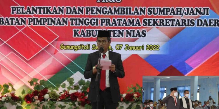 Pada acara tersebut diawali dengan pembacaan Keputusan Bupati Nias Nomor: 821.2/15.BKD/K/TAHUN 2022 tentang Pengangkatan Pegawai Negeri Sipil dalam Jabatan Pimpinan Tinggi Pratama Sekretaris Daerah Kabupaten Nias, dan dilanjutkan dengan pelantikan dan Pengambilan sLSumpah/Janji.