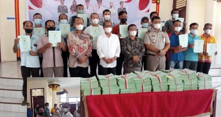 Nias, suarainvestigasi.com – Bupati Nias Ya’atulo Gulo,SE,SH,M.Si, menyerahkan secara simbolis Sertifikat Tanah untuk Rakyat Kabupaten Nias, Propinsi Sumatera Utara, bertempat di Aula Serba Guna, Kecamatan Gido, pada hari Kamis (06/01/2022)
