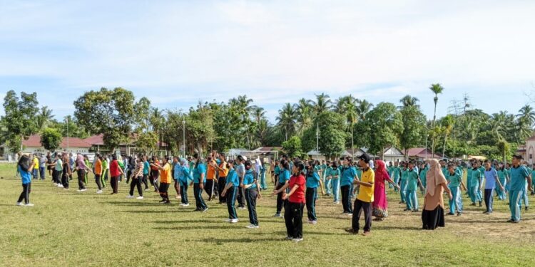 Nias Barat, suarainvestigasi.com – Untuk meningkatkan Imunitas dan Daya Tahan Tubuh, Camat Sirombu melaksanakan senam bersama yang diikuti oleh seluruh Pegawai Kantor Camat Sirombu, Personil Polsek Sirombu, Personil Koramil 09/Sirombu, Pegawai UPT. Puskesmas Rawat Inap Sirombu dan para Pelajar SMP dan SMA Negeri 1 Sirombu. Senam dimaksud dilaksanakan di Lapangan Bola Kaki Tetesua Sirombu, pada hari Jumat (04/03/2022).