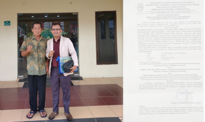 Ditempat yang sama, Yalisokhi Laoli, S.H, Kuasa Hukum Aloisius alias Benghok, menyampaikan bahwa Permohonan Peninjauan Kembali (PK) telah didaftarkan melalui PTSP Pengadilan Negeri Gunungsitoli pada hari Selasa tanggal 22 Juli 2025 dan telah diterima dengan Register Nomor : 5/P.K/Akta.Pdt/2025/PN Gst tertanggal 22 Juli 2025.