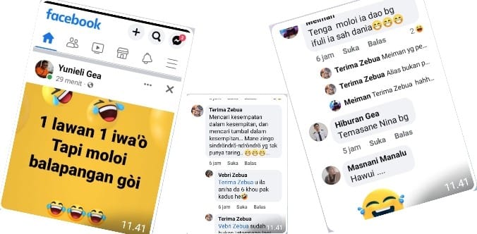 Dikutip dari Status Facebook Yunieli Gea hasil screenshot seorang warga kata sindiran Yunieli Gea ajak seseorang lawan untuk berkelahi detik-detik ke 29:00 menit sebelum kejadian Pengeroyokan korban Yusran Zebua di Dusun I, Desa Sihare’o Siwalihi secara bersama-sama, Jumat (24/03/2023)