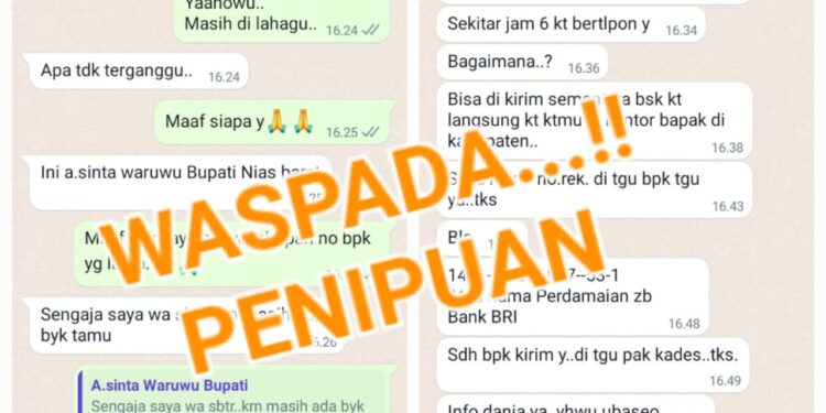 Seperti baru-baru ini, salah seorang pengguna aplikasi WhatsApp (WA) mengaku sebagai Bupati Nias Barat, Khenoki Waruwu atau Ama Sinta Waruwu, melakukan modus penipuan dengan meminta uang sebesar 5 juta rupiah kepada Augustinus Waruwu, Pj. Kades Ononamolo II Kecamatan Mandrehe Utara, untuk ditransfer ke nomor rekening BRI 142101001887531 atas nama Perdamaian Zebua.