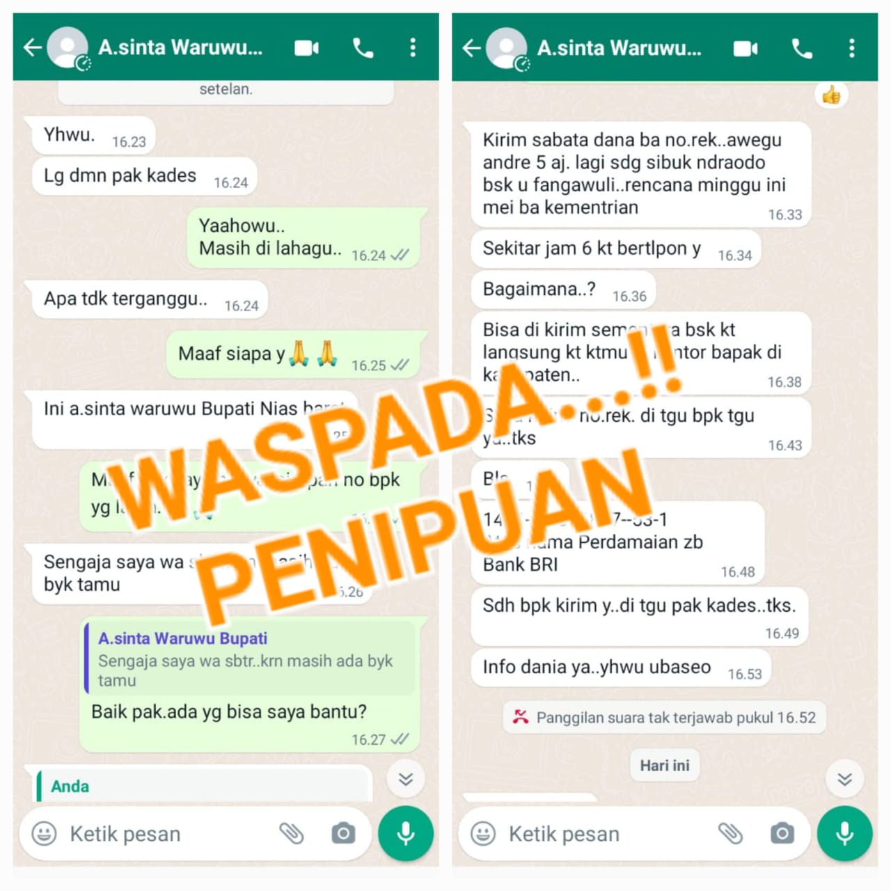 Seperti baru-baru ini, salah seorang pengguna aplikasi WhatsApp (WA) mengaku sebagai Bupati Nias Barat, Khenoki Waruwu atau Ama Sinta Waruwu, melakukan modus penipuan dengan meminta uang sebesar 5 juta rupiah kepada Augustinus Waruwu, Pj. Kades Ononamolo II Kecamatan Mandrehe Utara, untuk ditransfer ke nomor rekening BRI 142101001887531 atas nama Perdamaian Zebua.