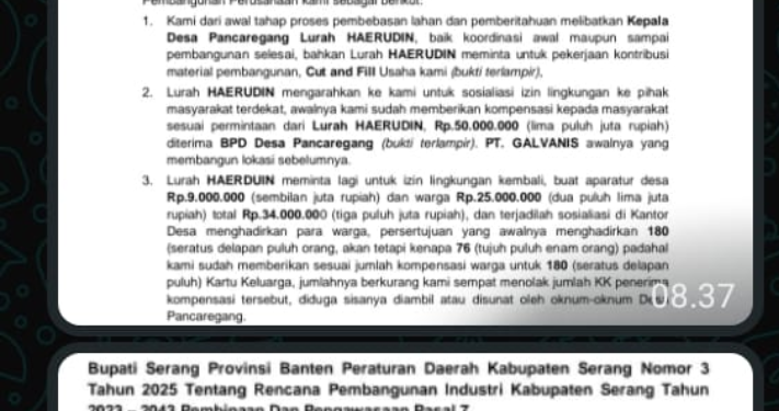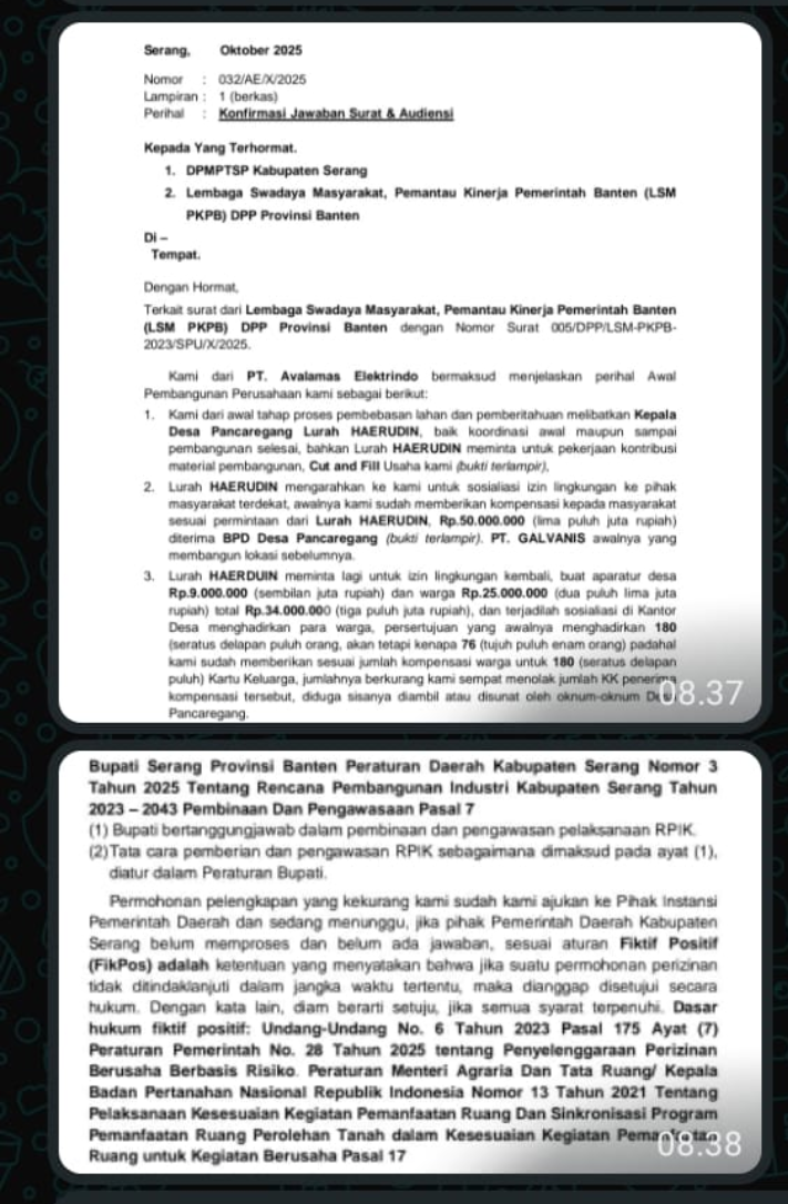 Serang – Media Suarainvestigasi.com – Sekjen LSM Pemantau Kinerja Pemerintah Banten (PKPB), menanggapi surat yang dilayangkan oleh Humas PT.Avalamas Elektrindo. Pasalnya, Humas PT.Avalamas Elektrindo, menuding oknum Desa Pancaregang menyunat dana sosialisasi, dan terkesan menyalahkan pihak Dinas Penanaman Modal dan Perizinan Terpadu Satu Pintu (DPMPTSP) Kabupaten Serang, lantaran tidak memproses perizinan yang diajukan. Rabu 22 Oktober 2025