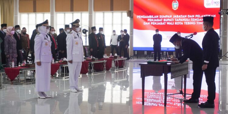 Kota Tebingtinggi, Suarainvestigasi.com – Gubernur Sumatera Utara Edy Rahmayadi mengambil sumpah jabatan dan melantik Sekretaris Daerah (Sekda) Kota Tebing Tinggi Muhammad Dimiyathi, S.Sos., M.Tp. menjadi Penjabat (Pj.) Wali Kota Tebing Tinggi dan Sekda Kabupaten Tapanuli Tengah (Tapteng) Yetti br Sembiring, S.STP., M.Si. menjadi Pj. Bupati Tapteng, Selasa (24/5) di Aula Tengku Rizal Nurdin, Rumah Dinas Gubernur Sumatera Utara Jl. Jend. Sudirman kota Medan.