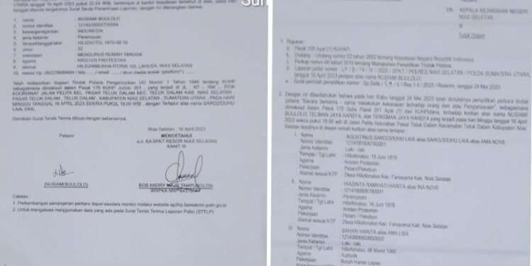 Nomor : LP/B/74/IV/2023/SPKT/POLRES NIAS SELATAN/POLDA SUMATERA UTARA tanggal 16 April 2023 pukul 22:54 Wib Nama : Nusiami Buulolo.