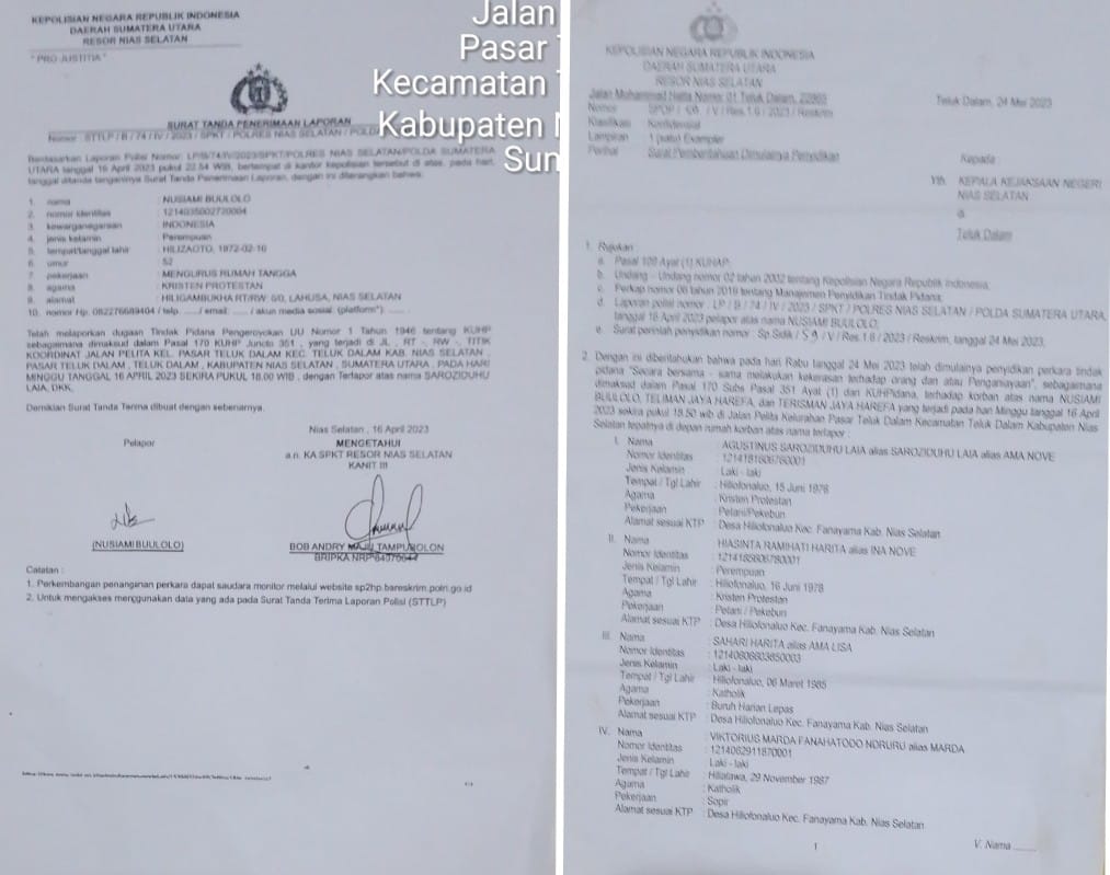 “Dengan ini diberitahukan bahwa pada hari Rabu tanggal 24 Mei 2023 telah dimulainya Penyidikan perkara tindak pidana “Secara bersama-sama melakukan kekerasan terhadap orang dan atau Penganiayaan” ,sebagaimana dimaksud dalam Pasal 170 Sub Pasal 351 Ayat (1) dari KUHPidana, terhadap korban atas nama NUSIAMI BUULOLO, TELIMAN JAYA HAREFA dan TERISMAN JAYA HAREFA yang terjadi pada hari Minggu tanggal 16 April 2023 sekira pukul 18:50 Wib di jalan Pelita Kelurahan Pasar Teluk Dalam Kecamatan Teluk Dalam Kabupaten Nias Selatan tepatnya di depan rumah korban atas nama terlapor :