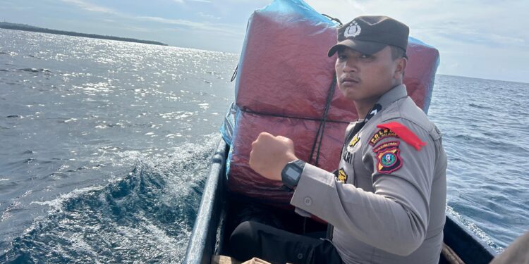 Empat kotak logistik surat hasil suara TPS 1 Desa Subaranun Bersama pejuang Demokrasi PPS Desa terlihat berada diatas sebuah sampan kecil yang mogok mesin dimana sedang dikawal Bripda Eben Zebua Menuju pulau-pulau batu barat