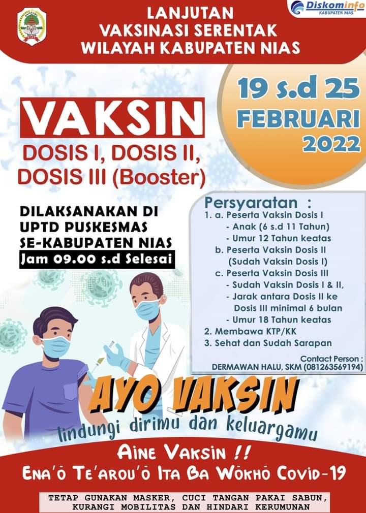 “Lanjutan Vaksinasi serentak ini telah kita mulai dari tanggal 19-25 Februari 2022, di semua UPTD Puskesmas Se-Kabupaten Nias. dan disasarankan kepada Anak Usia 6-11 Tahun dan Masyarakat Umum yang belum menerima Vaksin,” Ujarnya.