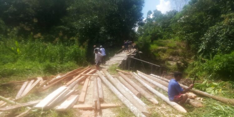 Nias Barat, suarainvestigasi.com – Warga Desa Lasarafaga terlihat sangat Antusias melaksanakan Gotong-royong untuk perbaikan Jembatan Gantung Bowou darurat sementara yang beralokasi di Dusun II Tumori Faga Desa Lasarafaga Kecamatan Mandrehe Barat, Kabupaten Nias Barat, Rabu (06/04/2022)