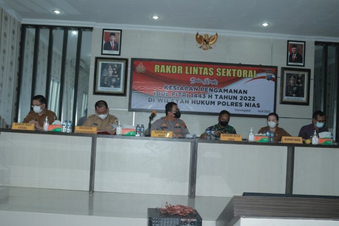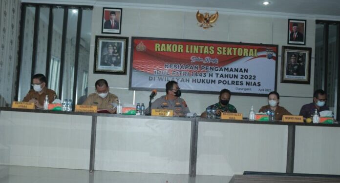 Nias, suarainvestigasi.com – Dalam rangka kesiapan pengamanan Hari Raya Idul Fitri 1443 H Tahun 2022, Bupati Nias yang di wakili oleh Kadis Perindag, Firmina A. Halawa, SE, menghadiri Rapat Koordinasi Lintas Sektoral yang dilaksankan di Polres Nias, Senin (25/04/2022).