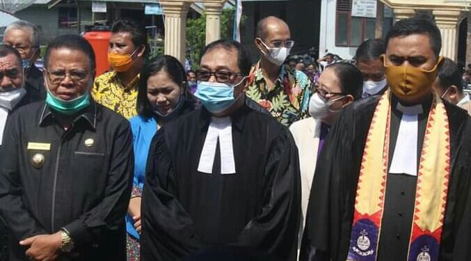 Nisbar, suarainvestigasi.com –Bupati Faduhusi Daeli.,S.Pd.,MA.,MM bersama Sekda Prof. Dr. Fakhili Gulo.,M.Sc Kab. Nias Barat dan sejumlah Pimpinan OPD Lingkup Pemkab. Nias Barat menghadiri Pelaksanaan Acara Pembukaan Rapat Kerja (RAKER) Guru/Pendeta Jemaat Se-Gereja ONKP. Acara yang dilaksanakan di Gereja di Gereja ONKP Jemaat Hiligafia Resort Hiligafia, Desa Sisobambaho Kec. Mandrehe Kab. Nias Barat, pada hari kamis 04/03/2021.