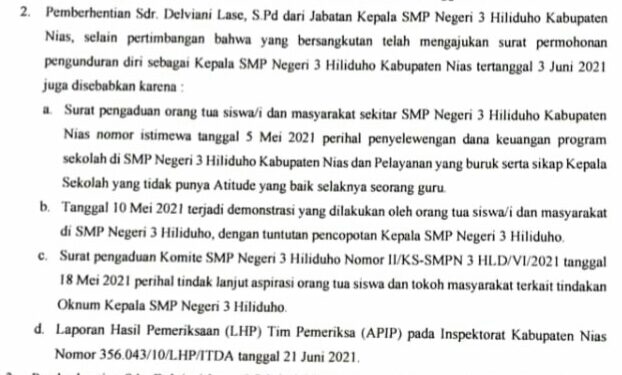 Nias, suarainvestigasi.com -Kepala Dinas Kominfo Kabupaten Nias Dahlanroso Lase, mengatakan kepada suarainvestigasi.com, pada hari Rabu (04/08/2021) bahwa Pemberhentian Delviani Lase,S.Pd dari Jabatan sebagai Kepala Sekolah SMPN 3 Hiliduho, Kabupaten Nias disebabkan oleh beberapa hal yakni: