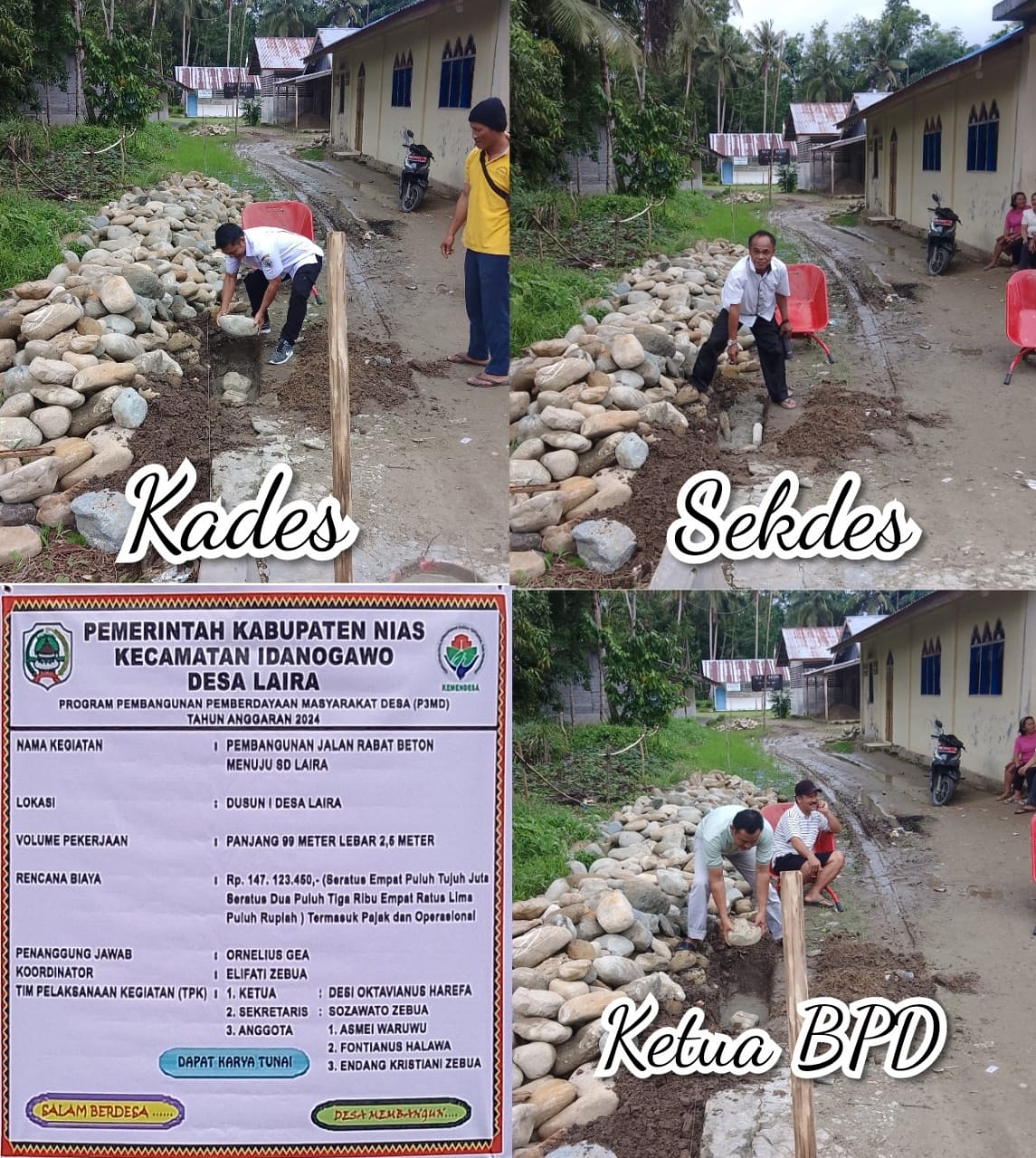 Kepala Desa Laira, Ornelius Gea menjelaskan kepada media ketika diwawancara dilokasi, fisik pembangunan jalan rabat beton menuju SD Laira bersumber dari Dana Desa (DD) tahun anggaran 2024, sudah melalui tahap musyawarah rapat Desa.