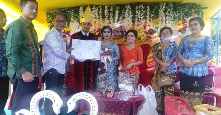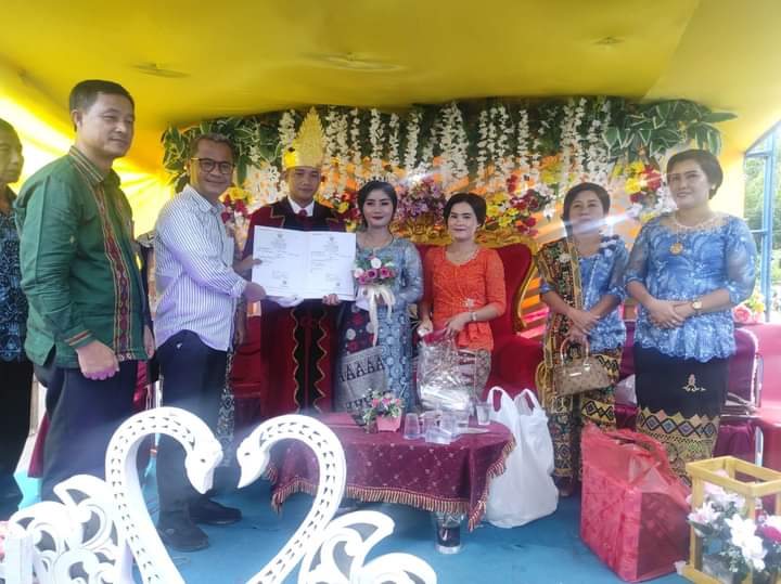 Bupati Nias Yaatulo Gulo,SE,SH,M.Si di dampingi Tehesokhi Hulu Plt. Kadis Kependudukan dan Pencatatan Sipil Kabupaten Nias menyerahkan Akta Perkawinan kepada pasangan Sadarman Gea/Juliana Hartati Zandroto di Desa Sisarahili Sogaeadu sebagai Penyerahan (langsung) Perdana kepada pasangan yang melangsungkan Pernikanan di Kabupaten Nias.