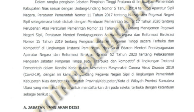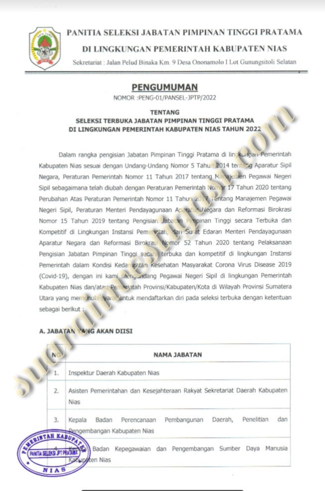 Nias, suarainvestigasi.com – Dalam Rangka Pengisian Kekosongan Jabatan Pimpinan Tinggi Pratama di Lingkungan Pemerintah Kabupaten (Pemkab) Nias, kembali membuka Seleksi terbuka Jabatan Pimpinan Tinggi Pratama Tahun 2022, Sabtu (11/06/2022)