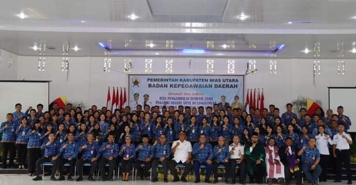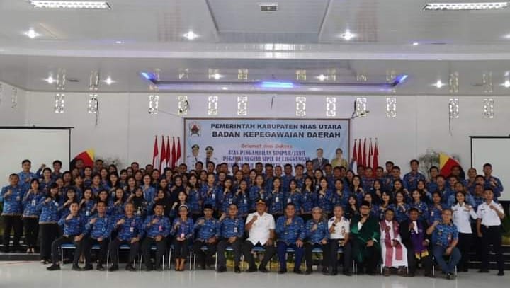 Bupati Nias Utara menyampaikan selamat atas pelantikan 107 Orang Pegawai Negeri Sipil di di Lingkungan Pemerintahan Kabupaten Nias Utara TMT 2022 yang telah melewati beberapa tahapan melalui CPNS kurang lebih satu tahun, serta berharap semoga dengan pelantikan ini PNS yang baru dilantik menjadi berkat di lingkungan tempat kerja masing-masing.