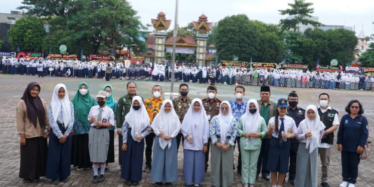 Kegiatan Kampanye Cegah Stunting Pemko Tebingtinggi bersama jajaran Dinas Kesehatan dan Dinas Pendidikan ditandai dengan minum bersama vitamin Tablet Tambah Darah oleh ratusan pelajar yang hadir di Lapangan Merdeka Tebingtinggi.