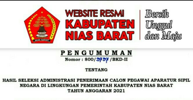 Pengumpan Bupati Nias Barat Nomor: 800/3311/BKD-II tanggal 30 Juni 2021 tentang Penerimaan Calon Pegawai Aparatur Sipil Negara di Lingkungan Pemerintah Kabupaten Nias Barat Tahun Anggaran 2021 dan Pengumuman Bupati Nias Barat Nomor: 800/3595/ BKD-II tanggal 19 Juli 2021 tentang Perpanjangan Masa Pendaftaran dan Penyesuaian Jadwal tahapan Pelaksanaan Seleksi Calon Pegawai Aparatur Sipil Negara di Lingkungan Pemerintah Kabupaten Nias Barat Tahun Anggaran 2021 maka berdasarkan hasil Verifikasi terhadap Dokumen Administrasi Pelamar yang diunggah pada laman. https://sscasn.bkd.go.id, dengan ini diumumkan sebagai berikut: