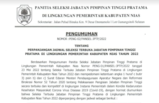 Dengan hormat di Umumkan bahwa Seleksi terbuka Pimpinan Tinggi Pratama di Lingkungan Pemerintah Kabupaten Nias Tahun 2022 di Perpanjang dengan jadwal sebagai Berikut :