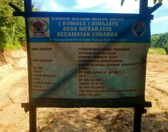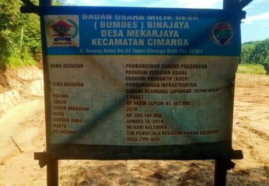 Lebak – Suarainvestigasi.com – Pembangunan lapangan sepak bola Proyek Bumdes, Desa Mekarjaya, Kecamatan Cimarga, Kabupaten Lebak diduga Tidak sesuai RAB.