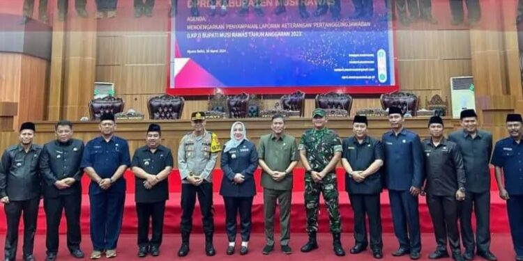 MUSI RAWAS, Suarainvestigasi.com – Bupati Musi Rawas, Provinsi Sumatera Selatan, Hj Ratna Machmud menyampaikan Laporan Keterangan Pertanggungjawaban (LKPJ) Tahun Anggaran 2023 dalam sidang paripurna DPRD Kabupaten Musi Rawas, Sabtu (30/3/2024.
