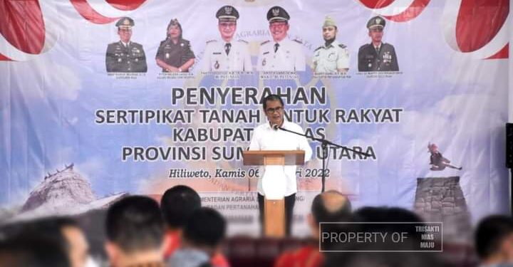 Nias, suarainvestigasi.com – Bupati Nias Ya’atulo Gulo,SE,SH,M.Si, Serahkan Secara Simbolis Sertifikat Tanah Kepemilikan untuk Rakyat Kabupaten Nias, Provinsi Sumatera Utara, bertempat di Aula Serba Guna, Kecamatan Gido, pada hari Kamis (06/01/2022).