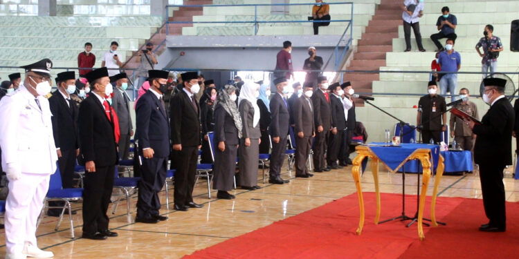 LAMPUNG UTARA, Suarainvestigasi.com – Sekretaris Daerah (Sekda) Kabupaten Lampung Utara (Lampura) Drs. Hi. Lekok, M.M., melantik dan mengambil sumpah 102 Pejabat Administrator (Eselon III) dan Pejabat Pengawas (Eselon IV) di lingkungan Pemkab setempat. Kegiatan pelantikan berlangsung di Gedung Olah Raga (GOR) Stadion Sukung Kotabumi. (09/03/2021).