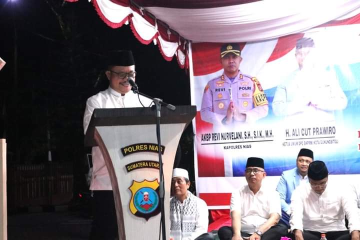 Peran dan dukungan dari seluruh lapisan masyarakat dalam bentuk apapun, baik berupa saran, masukan, kritikan konstruktif juga akan sangat bermanfaat dalam usaha mewujudkan generasi Emas 20245 yang akan datang, khususnya di kepulauan Nias. Kepada kita semua, melalui momentum kegiatan Tabligh Akbar dan Doa bersama dalam rangka hari Bhayangkara Ke-78 tahun 2024 ini dan dengan semangat kebersamaan, mari panjatkan doa tulus kita kepada Tuhan Yang Maha Kuasa, semoga bangsa Indonesia dapat menjadi bangsa yang kuat serta maju di segala bidang dan Kepolisan Republik Indonesia utamanya polres Nias dapat menjadi Institusi yang mampu dalam mengemban seluruh tugas guna mewujudkan keamanan dan ketertiban bangsa dan negara serta dalam upaya melindungi masyarakatnya. Himbauan Sowa’a mengakhiri sambutannya.