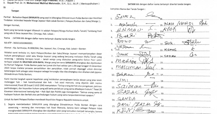 Perihal : Bebaskan Bapak Sanajaya yang saat ini ditangkap Ditreskrimum Polda Banten dan Hentikan Tindakan Intimidasi kepada Warga Jayasari Kabupaten Lebak Banten (Pelapor/Korban dan SaksiWarga );