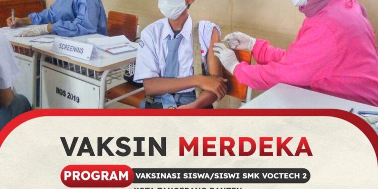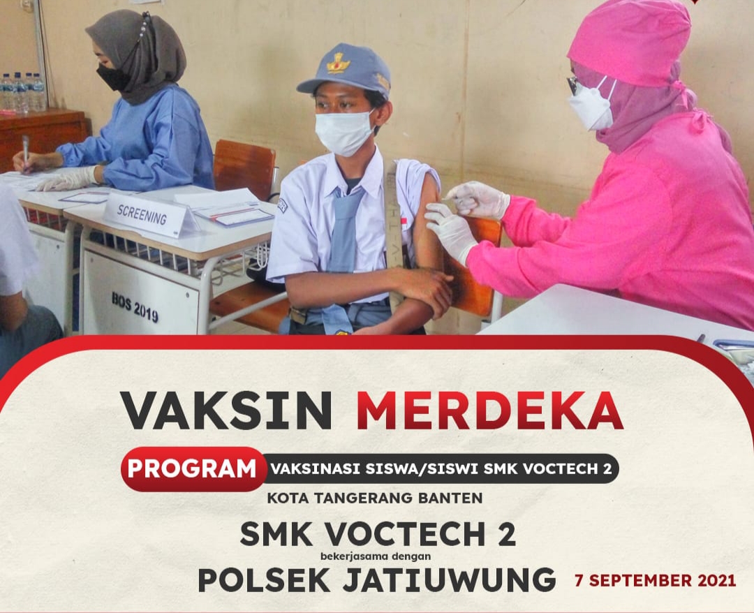 SMK Voctech 2 bekerjasama dengan Polsek Jatiuwung Kota Tangerang, Banten menggelar vaksinasi kepada peserta didik sekolah setempat pada Selasa (7/9), kegiatan vaksin Covid-19 ini dimulai sejak pagi hari hingga selesai. Dengan tetap menerapkan protokol kesehatan pada prosesnya.