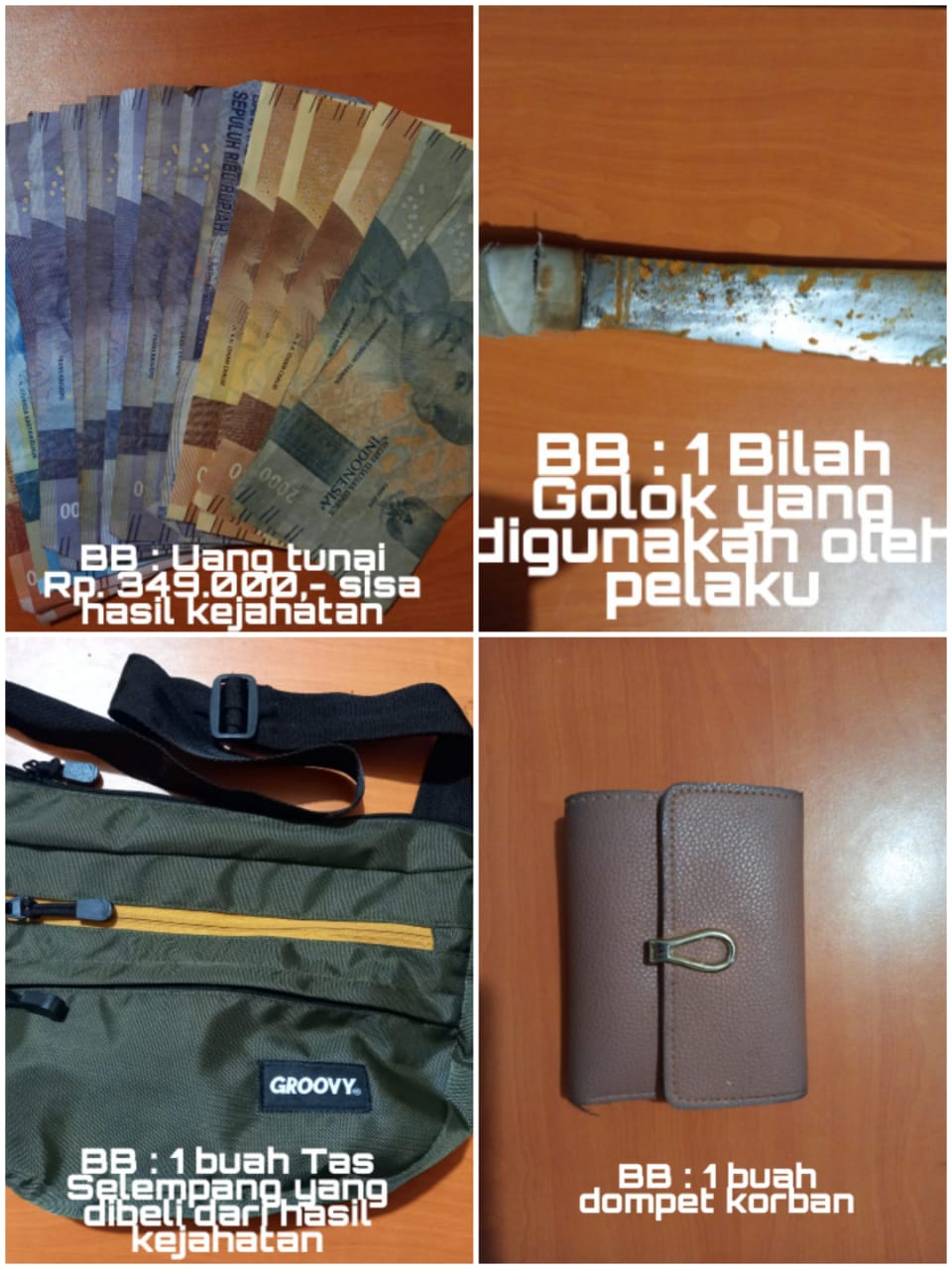 Kepada polisi, tersangka mengakui uang hasil kejahatan dibelikan narkoba jenis sabu di daerah Jakarta. Dari tangan tersangka diamankan barang bukti sebilah golok, dompet korban, tas pelaku, sisa uang korban sebesar Rp. 349.000, dan narkoba jenis sabu.