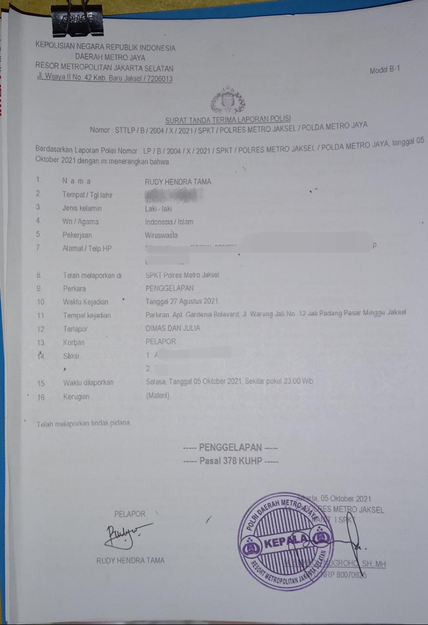 “Saya sudah membuat Laporan Polisi terkait tindak pidana dugaan Penggelapan pasal.378 Nomor : LP/B/2004/X/2021/SPKT/Polres Metro Jaksel/Polda Metro Jaya pada tanggal 05 Oktober 2021,namun sudah berbulan-bulan pelaku belum juga ada tindakan dari pihak Polres Jakarta Selatan.” kata Rudi Hendra Tama pada awak media Selasa, (28/12/2021) Kota Tangerang