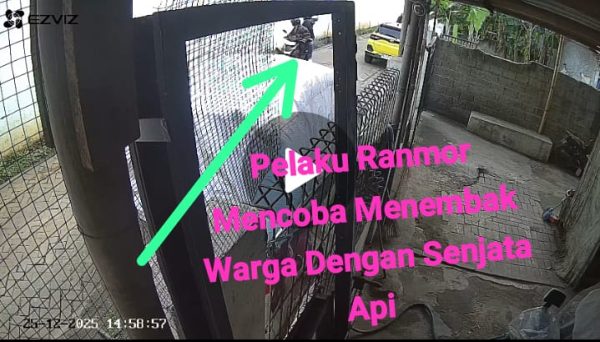 “Tadi malingnya ber 2 yang satu dia di motor, terus yang satu sempet mau maling, terus ketauan sama tetangga langsung di teriakin, pas mau di kejar dia ngeluarin beceng (senjata api-red),” kata salah satu warga setempat, pada Kamis (25/12/2025).