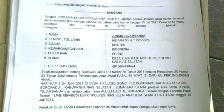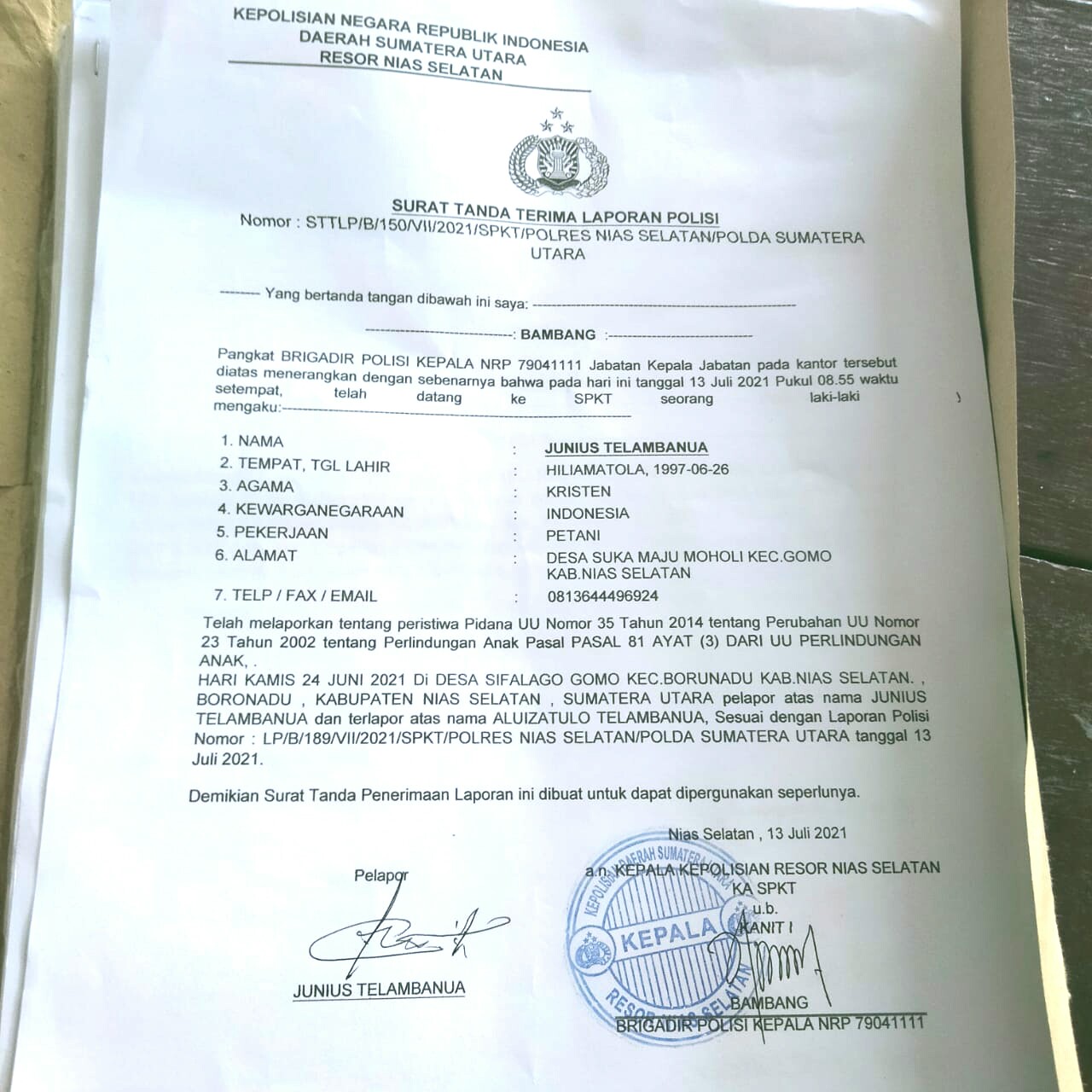 Pelapor atas Nama Junius Telaumbanua dan Terlapor atas Nama Aluizatölö Telaumbanu, sesuai dengan Laporan Polisi Nomor: LP/B/189/VII/2021SPKT/POLRES NIAS SELATAN/POLDA SUMATERA UTARA tanggal (13/07/2021).