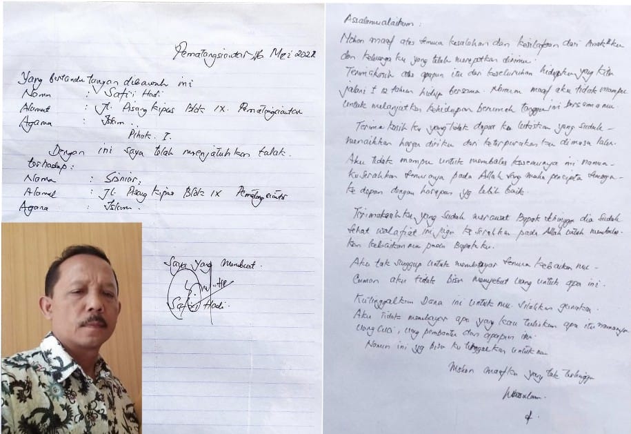 Medan, suarainvestigasi.com – Selembar Surat yang di tinggalkan Safi’i untuk Istri, “Sisniar Merasa dihianati dan di Dzolimi dalam Hubungan Rumah Tangga, seorang Istri tuduh suami kuras harta Gono-Gini dan jatuhkan talak 1 tanpa gugatan Ke Pengadilan Agama (PA) lalu kabur memboyong barang-barang (perabotan) Rumah disaat Sisniar pergi mengajar di salah satu Sekolah yang ada di Siantar.