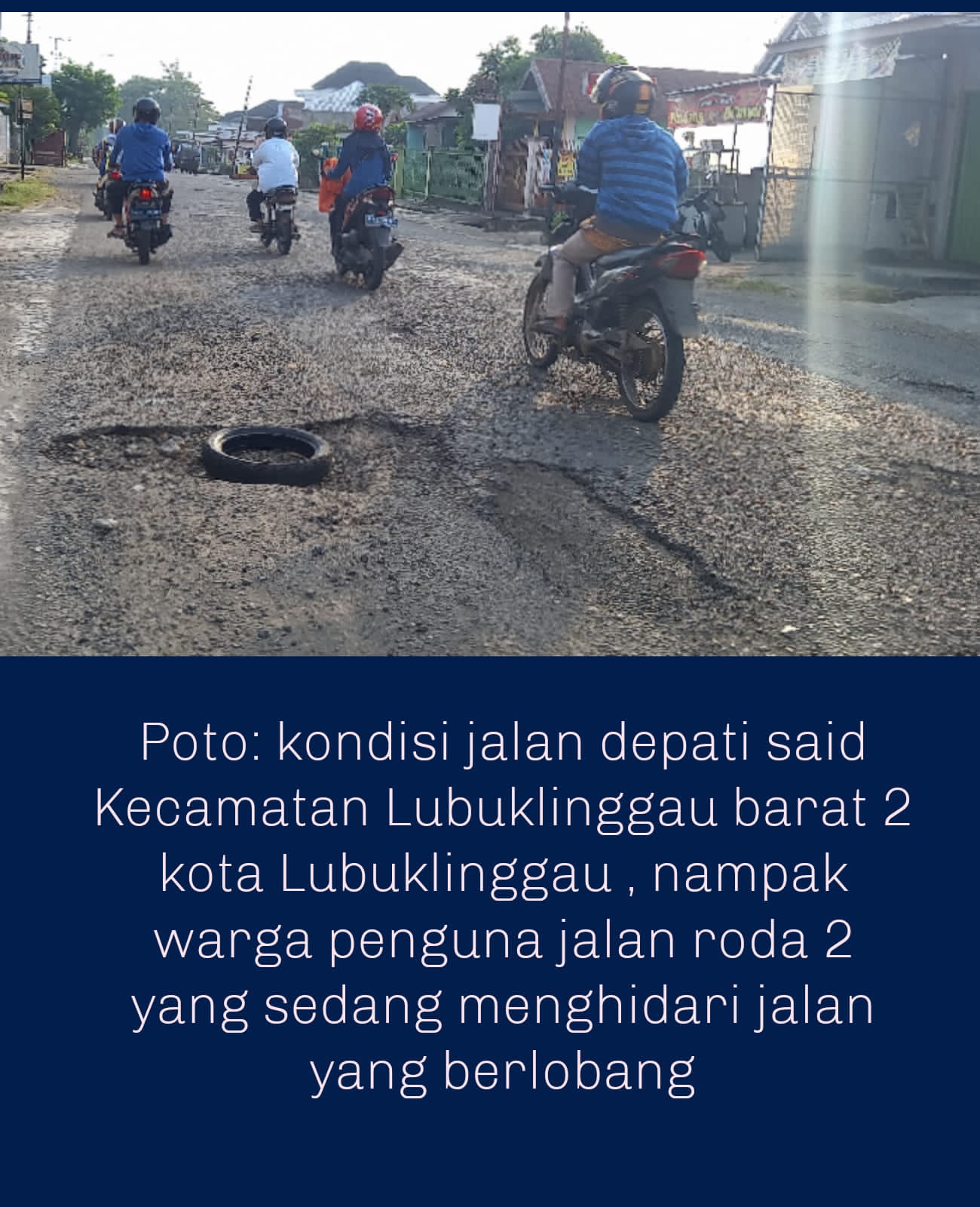 Selasa 29/3 Sala satu warga penguna jalan yang sedang melintasi jalan depati said Kecamatan Lubuklinggau Barat 2 , umar , saat di jumpai awak ia membenarkan jalan depati said sekarang ini kondisi jalannya banyak yang berlobang dan aspalnya terkelupas dan lobang cukup dalam sekitar 5 cm lebih . Kami sebagai penguna jalan berharap kepada Pemerintah Kota Lubuklinggau tahun 2022 jalan depati said ni di benari agar tidak terjadi kecalakaan ,” ujar warga penguna jalan