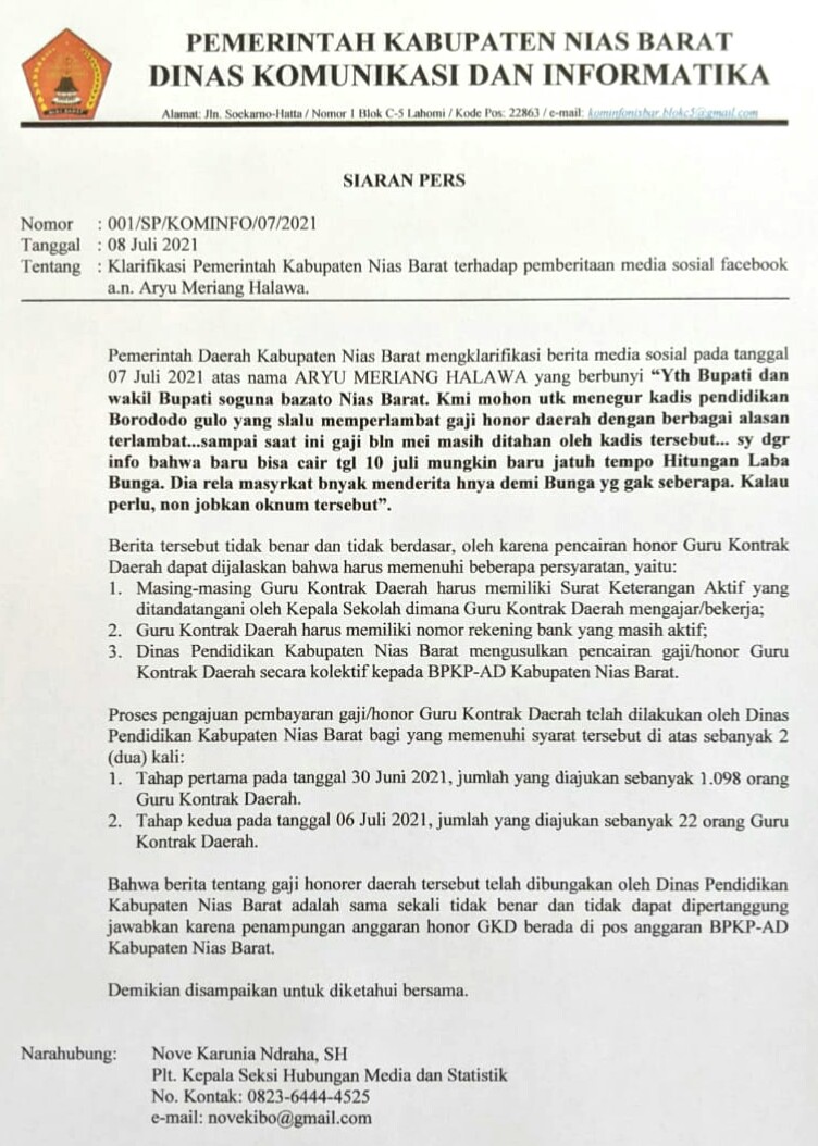 Pemerintah Daerah Kabupaten Nias Barat mengklarifikasi Berita Media Sosial pada tanggal (07/07/2021) An.Aryu Meriang Halawa yang berbunyi, “Yth Bupati dan Wakil Bupati Soguna Bazato Nias Barat. Kami mohon utk menegur Kadis Pendidikan, Borododo Gulö yang selalu memperlambat gaji Honorer Daerah dengan berbagai alasan terlambat sampai saat ini gaji Bulan Mei masih ditahan oleh Kadis tersebut saya dengar Informasi bahwa baru bisa cair tanggal (10/07/2021) mungkin baru jatuh tempo Hitungan Bunga Laba.