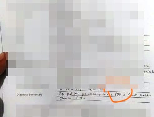 “Anehnya itu disurat rujukan tersebut dicantumkan bahwa pasien berstatus PDP (Pasien Dalam Pengawasan) covid-19 atau yang disebut dengan virus Corona,”