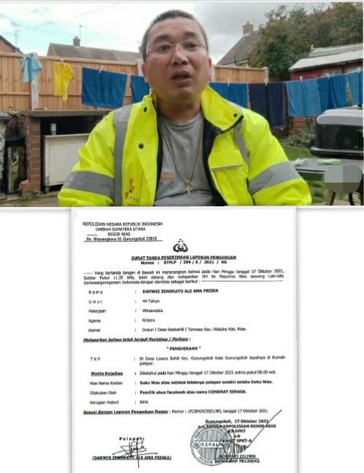 Pelapor: Atas Nama Darwis Zendratö Als Ama Friska, Umur 44 Tahun, Pekerjaan Wiraswasta, Agama Kristen, Alamat Dusun I, Desa Sisobahili Tanoseo, Kec Hiliduho, Kab Nias, Melaporkan bahwa telah terjadi Peristiwa/Perkara “Penghinaan” Melapor di Polres Nias Atas Nama Korban Suku Nias dilakukan oleh Pemilik Alun Facebook atas Nama Condrat Sinaga sesuai dengan Laporan Pengaduan Nomor: LP/284/X/2021/NS, tanggal 17/10/2021.