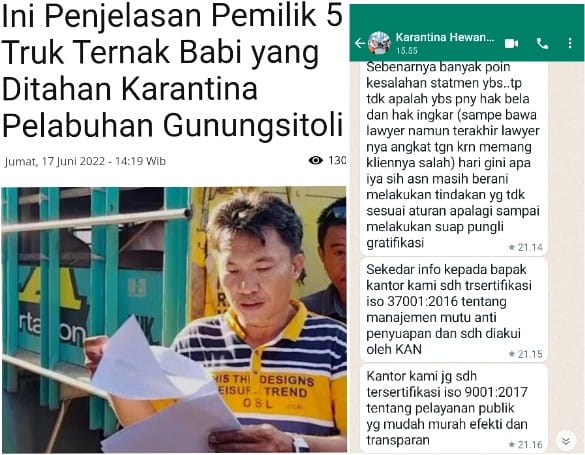 Hasil Konfirmasi Wartawan kepada pihak Karantina Gunungsitoli, terkait Statmen Binahati Ziliwu pemilik Babi ilegal di Pemberitaan diatas Pihak Karantina Menegaskan. Sebenarnya banyak Poin kesalahan Statmen yang bersangkutan tetapi tidak apalah yang bersangkutan punya hak bela diri dan hak ingkar (sampe bawa lawyer) namun terakhir lawyer nya Angkat tangan karena memang (Kliennya salah) hari gini apa iya sih alasan masih berani melakukan tindakan yang tidak sesuai Aturan apalagi sampai melakukan Suap Pungli Gratifikasi,”