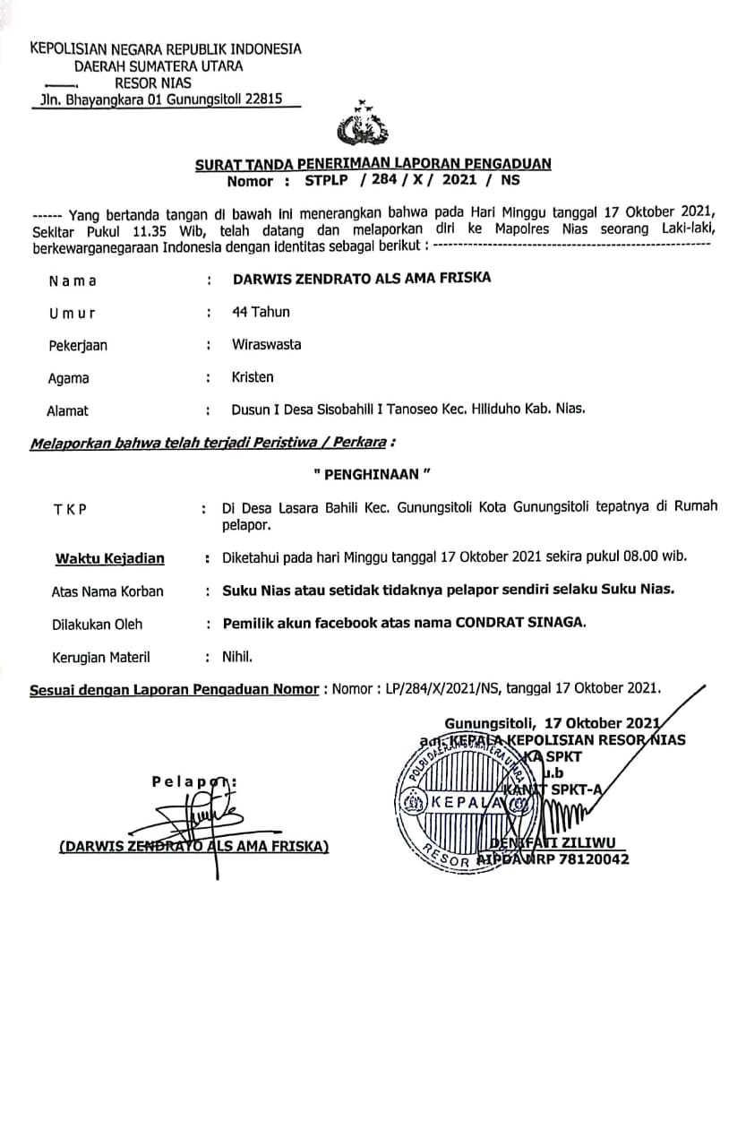Atas Nama Darwis Zendratö Als Ama Friska, Umur 44 Tahun, Pekerjaan Wiraswasta, Agama Kiristen, Alamat Dusun I, Desa Sisobahili I Tanoseo, Kec Hiliduho, Kab Nias melaporkan bahwa telah terjadi Peristiwa/Perkara “Penghinaan” Melapor di Polres Nias atas Nama korban Suku Nias atau setidak-tidaknya Pelapor sendiri selaku Suku Nias, dilakukan oleh Pemilik Akun Facebook atas Nama Condrat Sinaga sesuai dengan Laporan Pengaduan Nomor: LP/284/X/2021/NS, tanggal 17/10/2021.